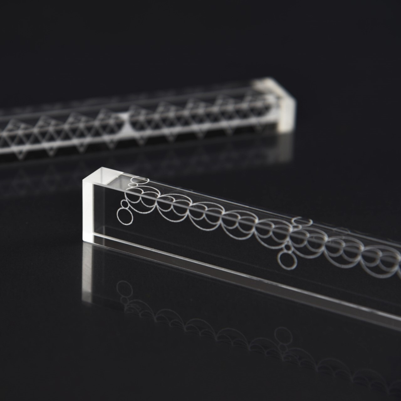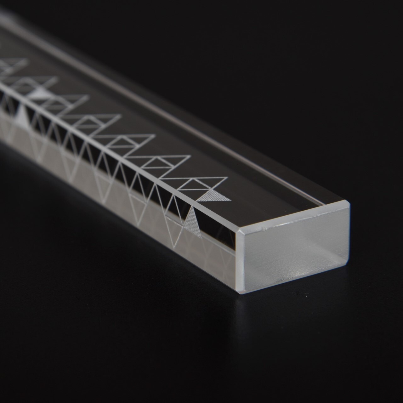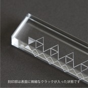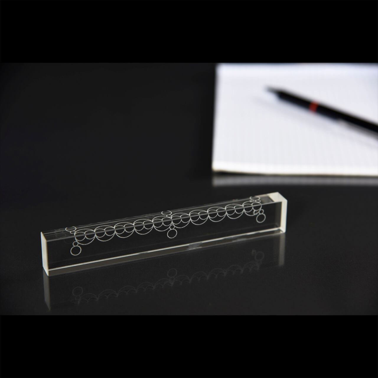 バー状の光学ガラスの廃材を研磨し、2面にレーザーで幾何学模様を刻印しました。模様は5mm、10mm、50mmの目盛になっています。ペーパーウェイトとしてもお使い頂けます。2種類の模様(A:三角形/B:円形)からお選びください。