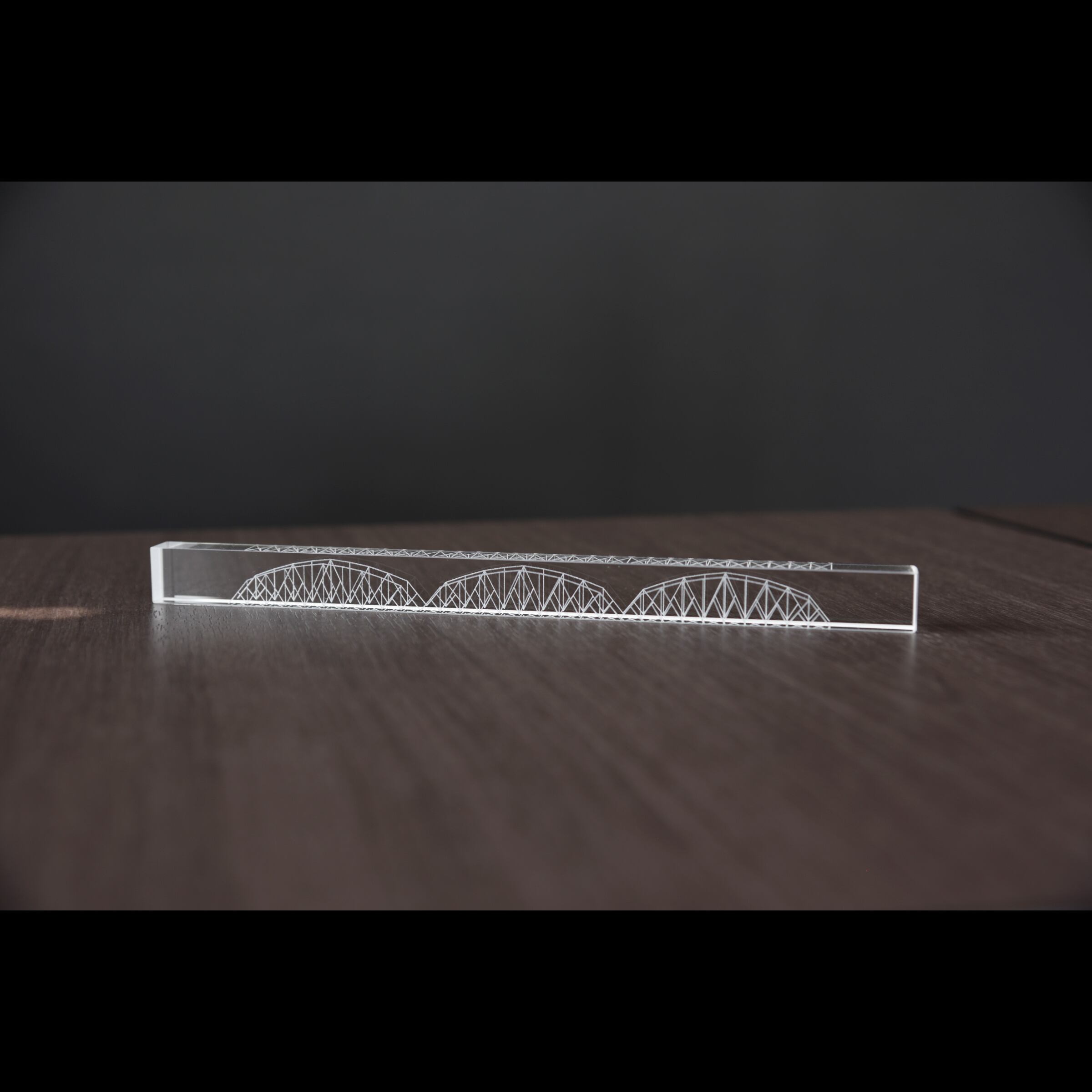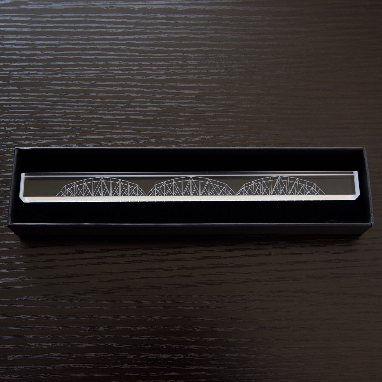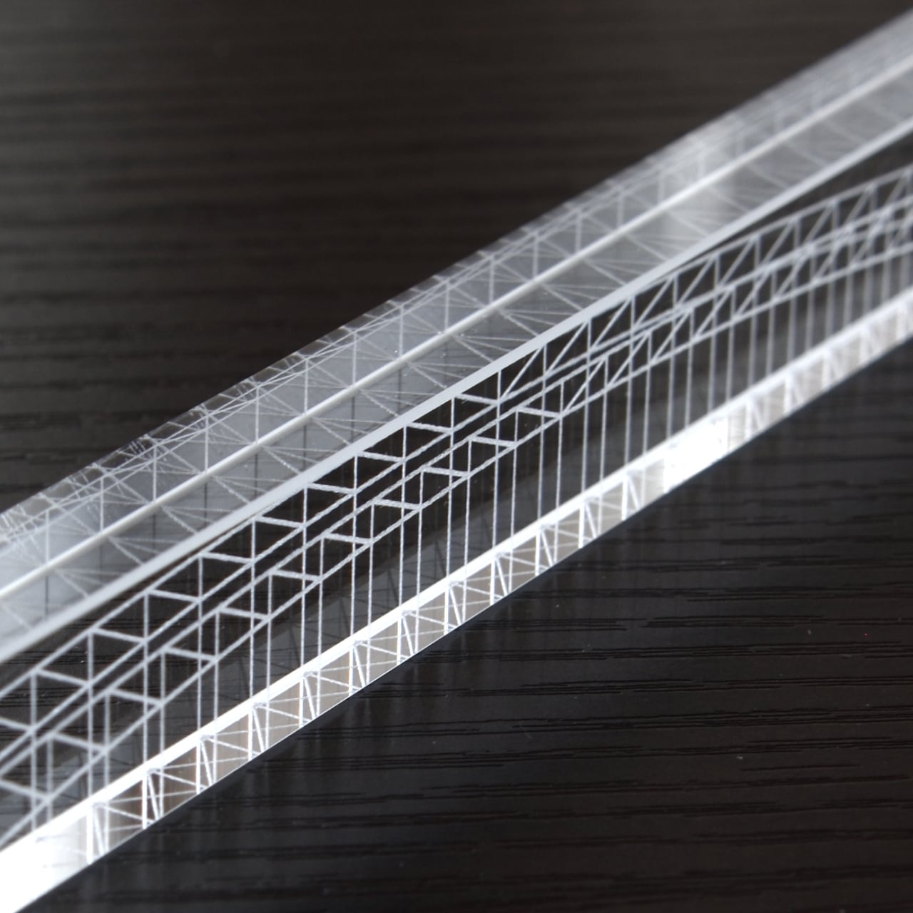 光学ガラスの廃材を研磨し、3面に橋のデザインをレーザー彫刻したペーパーウェイトです。3面に彫刻することで、立体的な橋に見えるようになっています。またデザインは5mm間隔の目盛にもなっており、簡易的なものさしとしてもお使いいただけます。デスクの上に出しっぱなしにしても美しいデザインを目指しました。