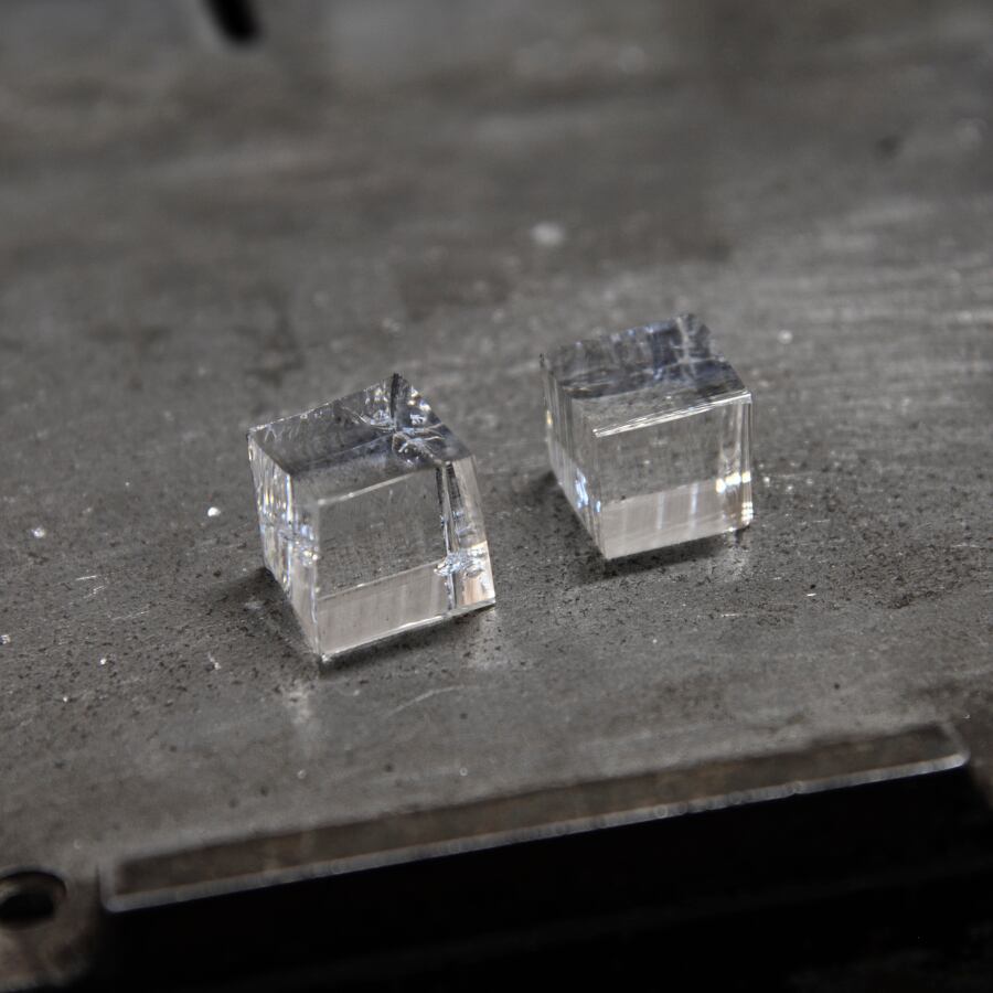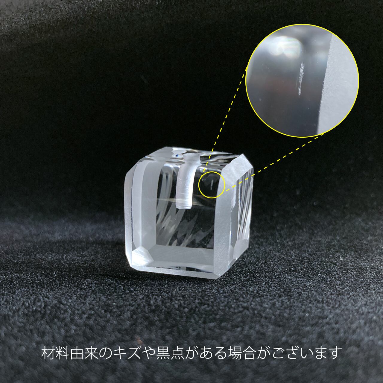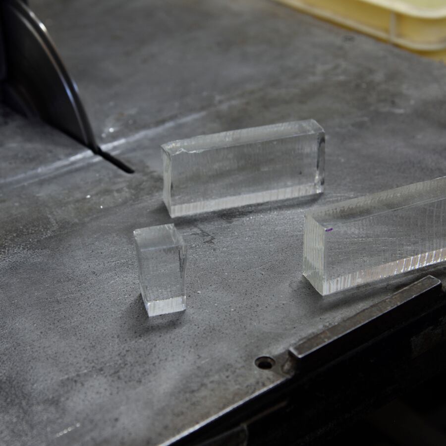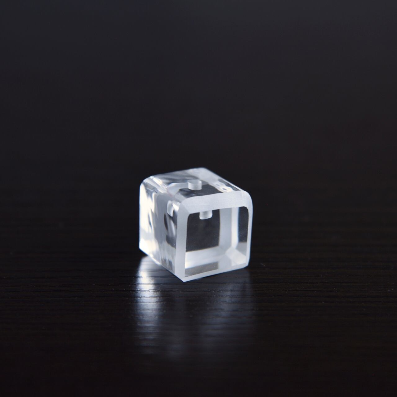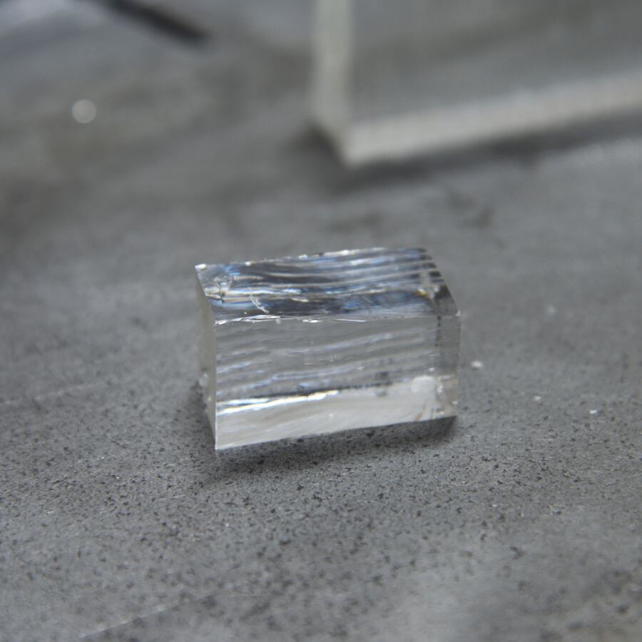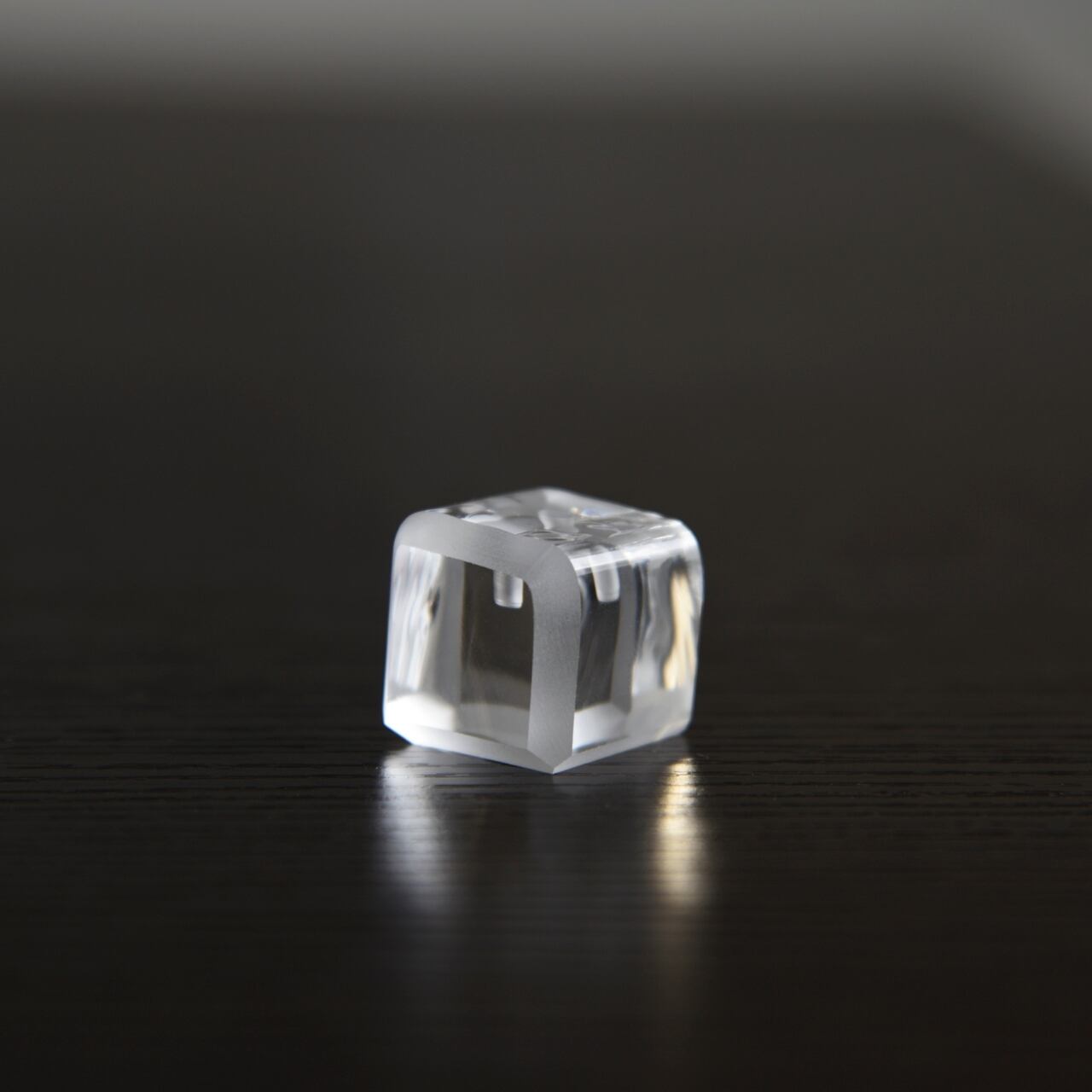 未加工の光学ガラスの板材料を、熱で割ってキューブ状にしました。溶解されたガラスが固まる時に表面にできる波のような模様をそのまま残し、切断では得られない自然な雰囲気が魅力となっています。また面取り部分はスリガラスのような半透明の状態です。