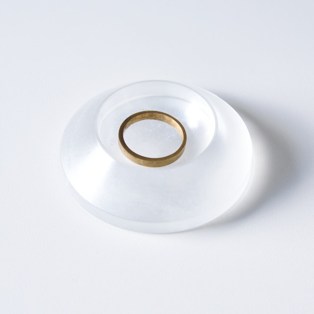 特徴的な凹レンズ形状のガラスの小物入れです。日常使いのアクセサリーを入れたり、ひっくり返してディスプレイ台としても使えるので、小さな鉱物標本などを置いてもかわいいです。