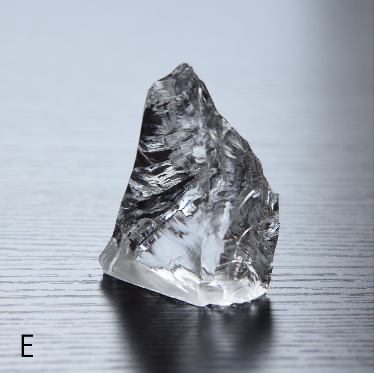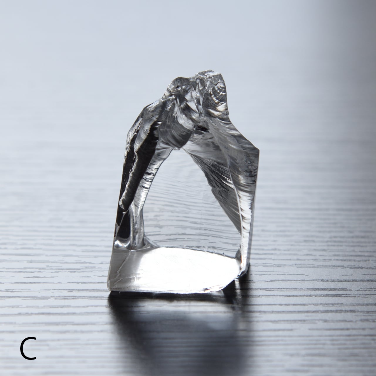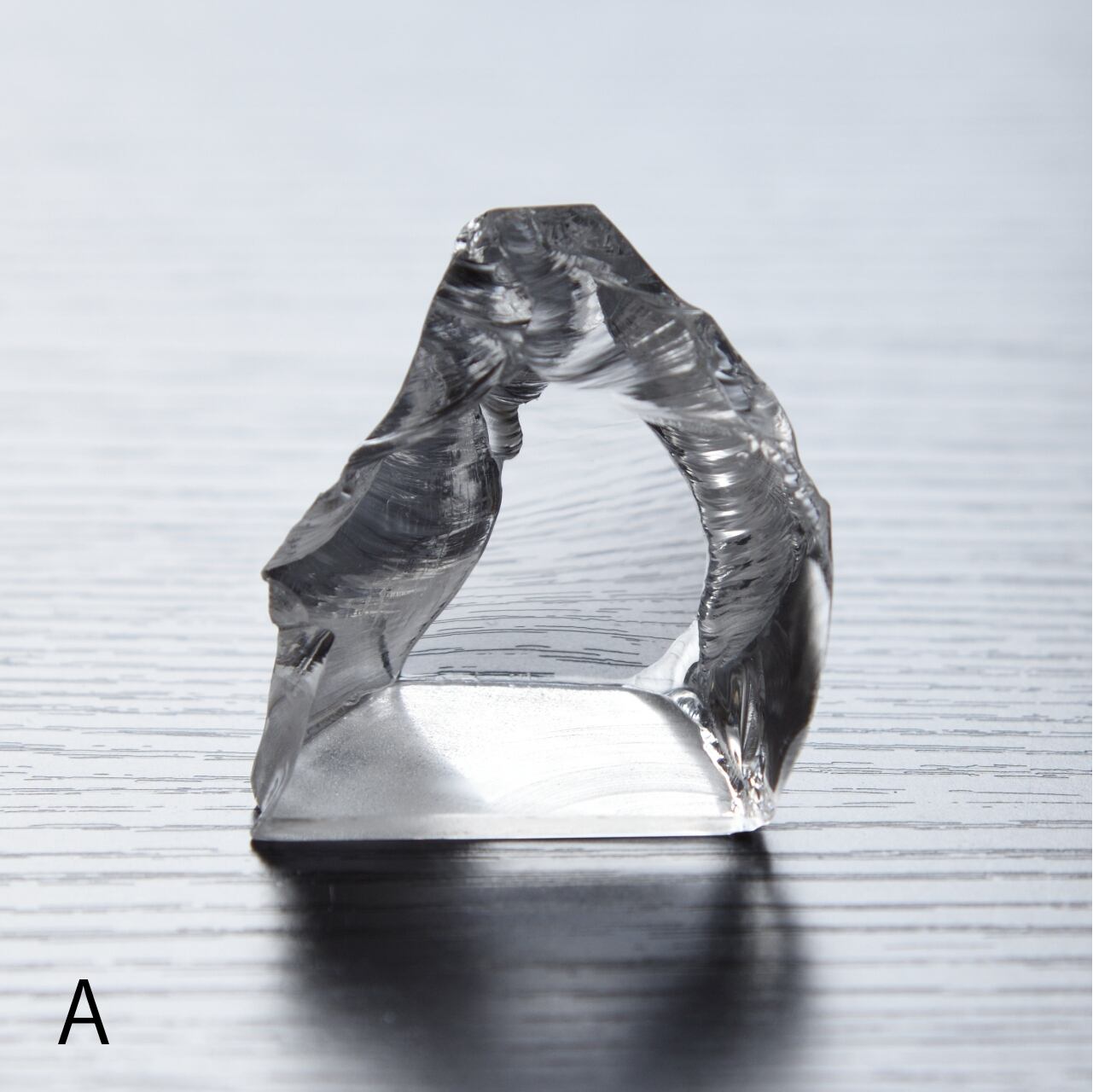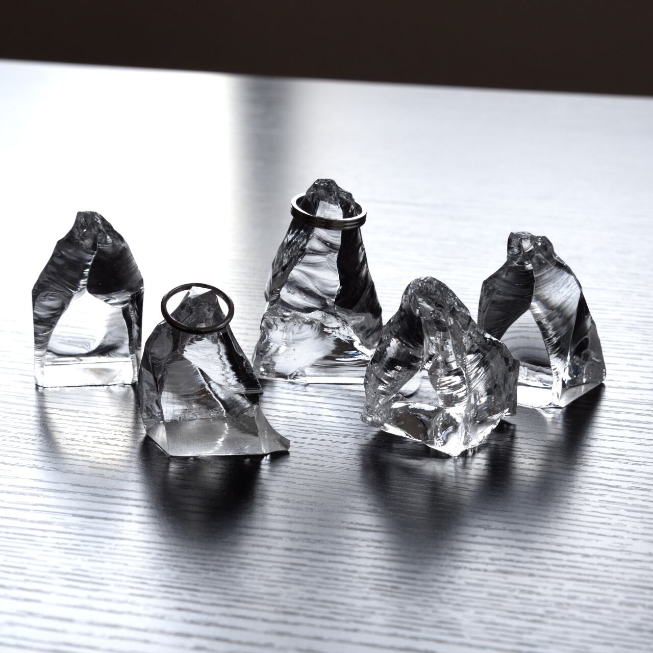 光学ガラスのブロックを割って作ったリングホルダーです。透明なので、どんなリングとも合わせやすいです。偶然生まれた形の美しさをお楽しみください。